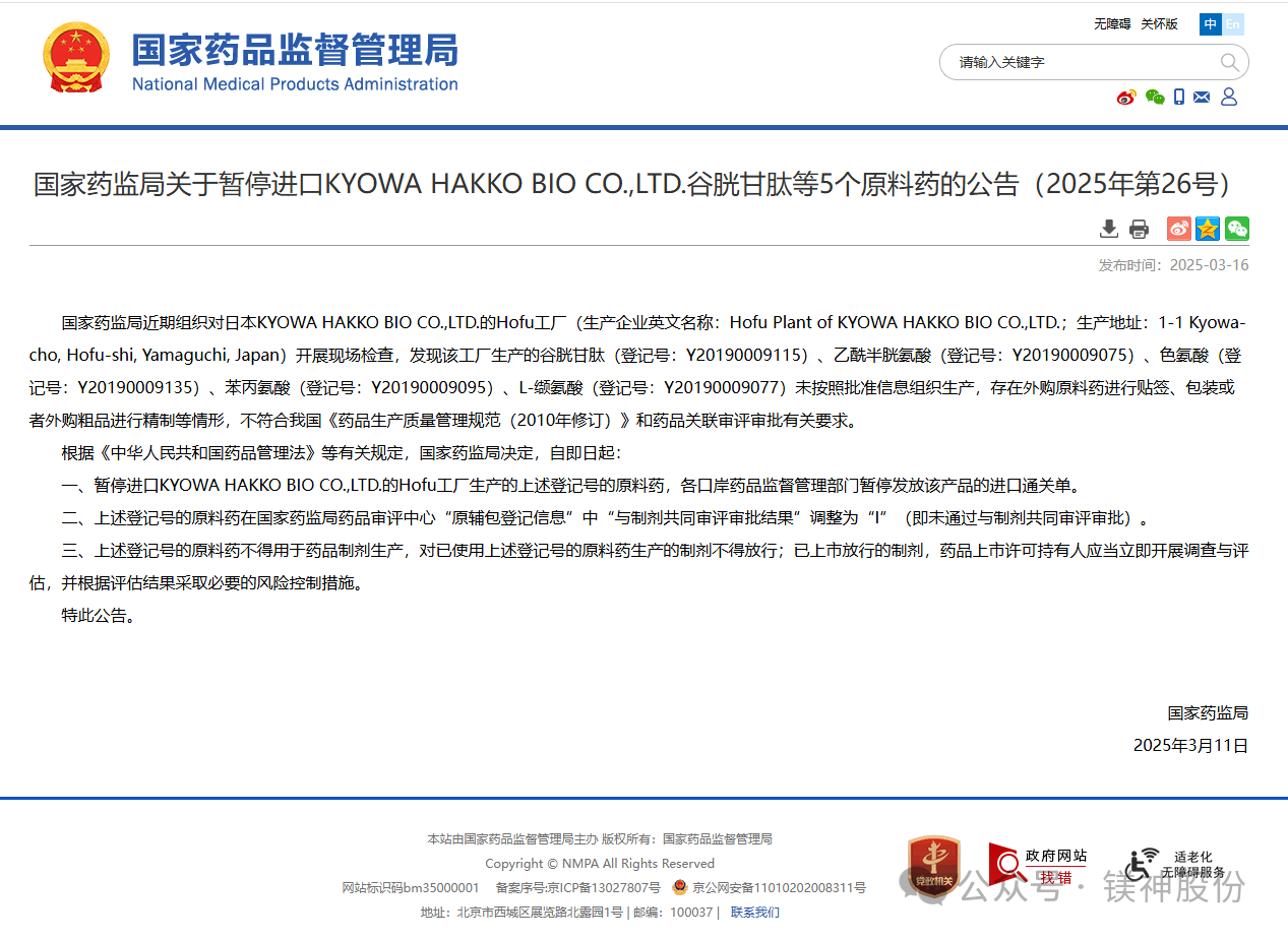 国家药监局暂停进口日本KYOWA HAKKO BIO CO.,LTD.原料药,国