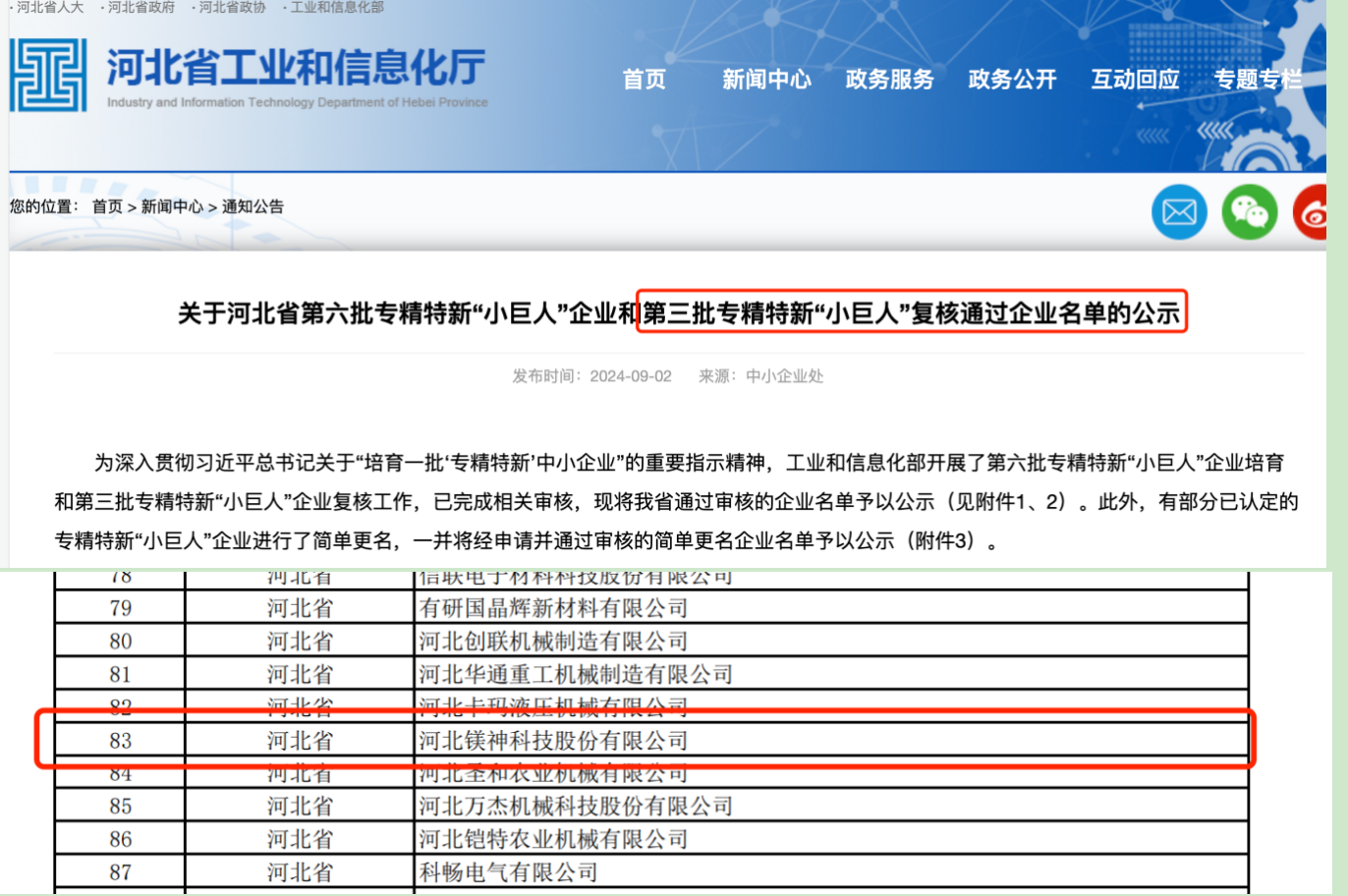 河北镁神科技股份有限公司近日喜讯连连,成功通过了国家级“专精特新小巨人”企业的复审。 据悉,此次复审由工业和信息化部组织专家进行,在复审过..热线电话