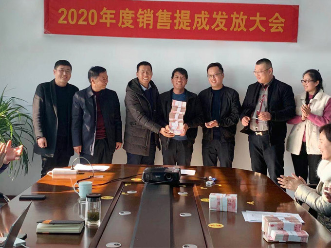 2021年1月2日,上午11点30分左右,河北镁神科技股份有限公司在会议室召开业务员提成发放大会。一摞摞的红色人民币整齐的摆放在桌子上,看着..
