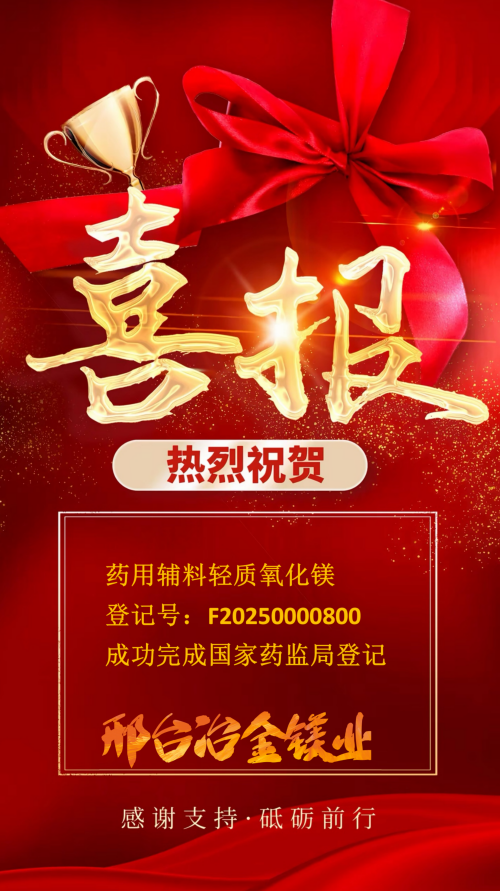 喜报!冶金镁业 药用辅料用轻质氧化镁产品 成功完成国家药监局登记注册