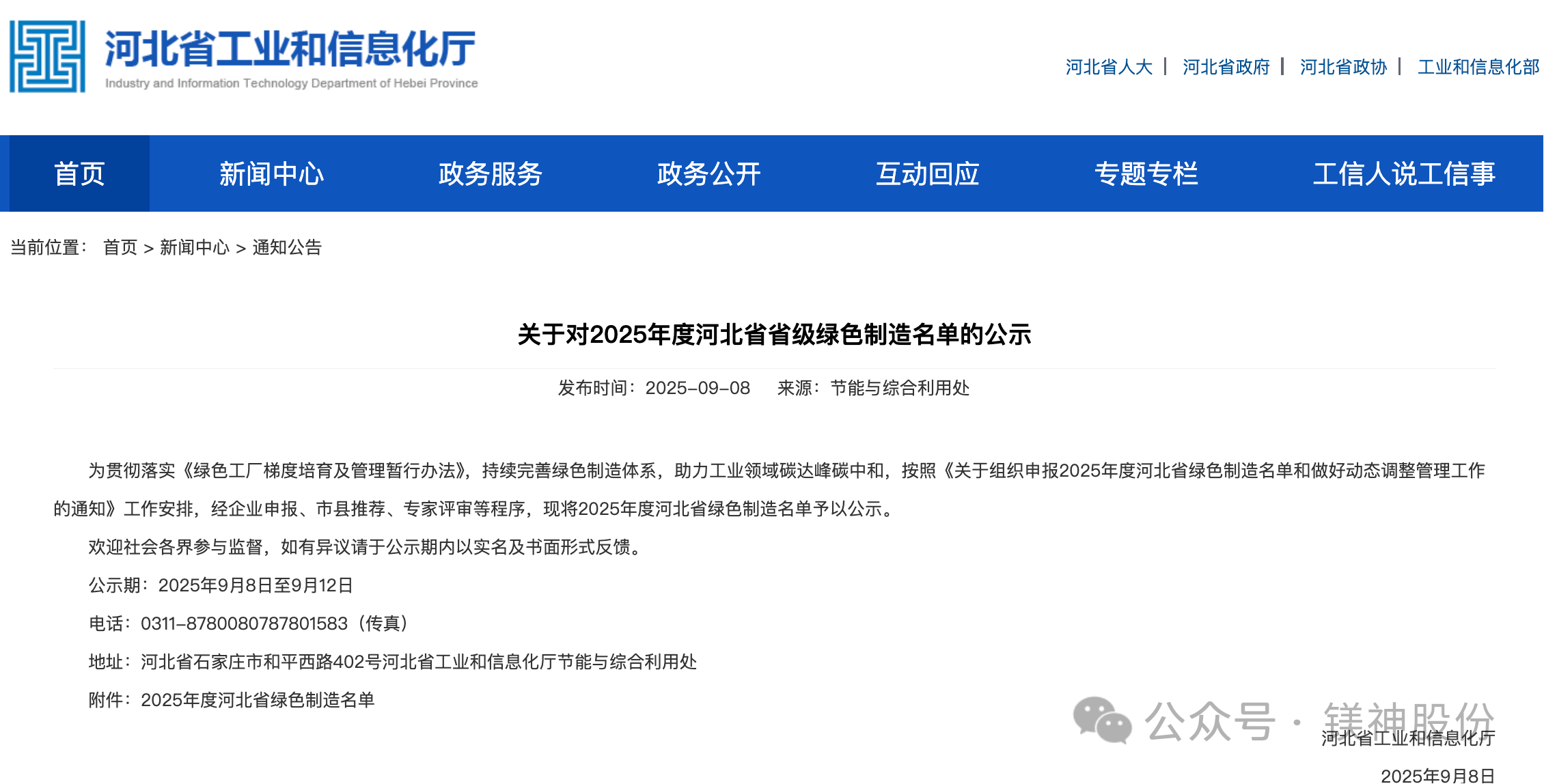 2025年9月8日,河北省工业和信息化厅正式公布了2025年河北省绿色制造名单。河北镁神科技股份有限公司(以下简称“镁神科技”)凭借在绿色制造、节能降耗、清洁生产等方面的突出表现,成功入选“..