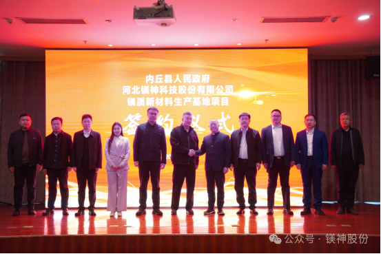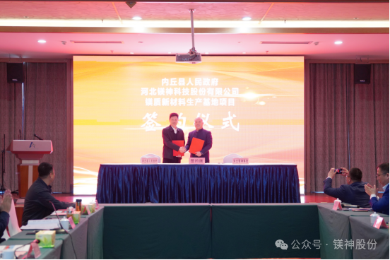 2025年3月28日,河北镁神科技股份有限公司与内丘县人民政府在阿尔卡迪亚酒店悦盛厅隆重举行镁质新材料生产基地项目签约仪式。该项目总投资20.25亿元,选址邢台市内丘县工业园区,致力打造世界级高端镁质新材料生产基地,为区域经济高质量发展注入新动能。