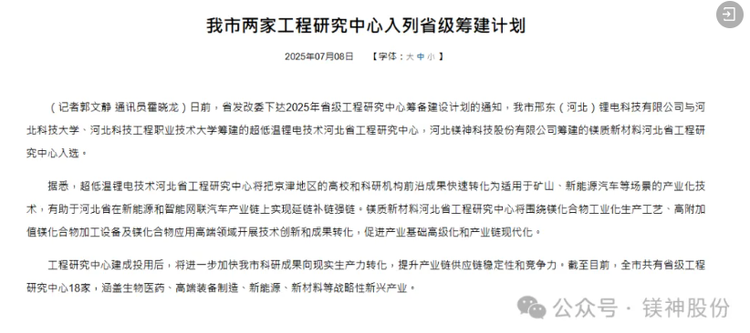 2025年7月8日,河北省发展和改革委员会正式公布了新一批河北省工程研究中心筹建计划入选名单。由河北镁神科技有限公司(简称:镁神科技)牵头筹建的“镁质新材料河北省工程研究中心”经过严格遴选和专家评审,成功获批立项,正式列入省级工程研究中心筹建计划名单!这是镁神科技发展历程上的又一重要里程碑,也是河北省对我公司在镁质新材料领域创新能力与发展潜力的高度认可!