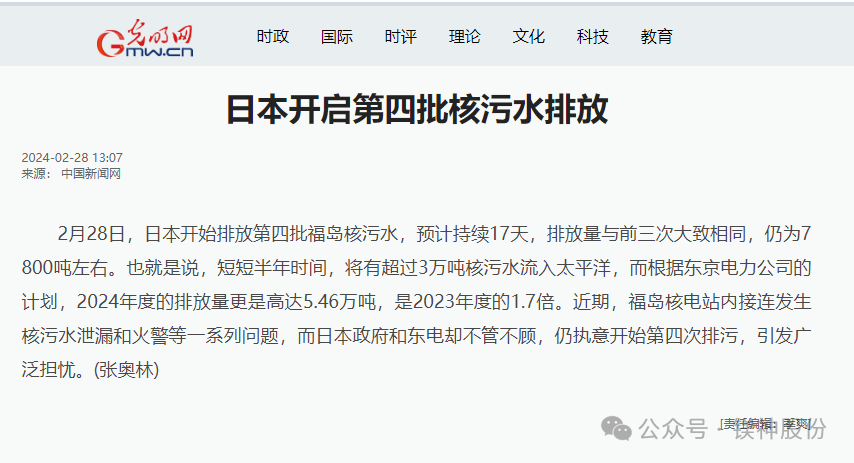 去年八月份以来,由于日本福岛核电站的事故,大量的核污水被排放到海中,使得海水中的放射性物质浓度大幅超标。而且日本东电公司对排海的核污水几乎没有处理,造成排放的核污水中放射性物质不是“简单”的氚,更有铯、镅、锶等这类半衰期(既辐射达到当前辐射剂量一半的时间)超长的元素。