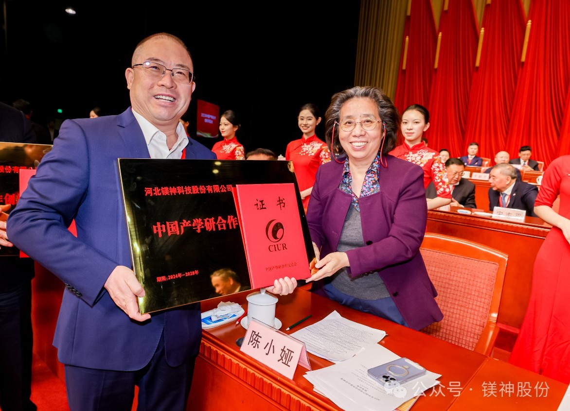 新闻摘要:3月17日,以“产学研聚焦:新动能、新模式、新产业”为主题的第十五届中国产学研合作创新大会在北京会议中心隆重召开,河北镁神科技股份有限公司董事长孙文受邀出席。会议表彰了2023年在产学研深度融合方面做出贡献的先进单位和个人,河北镁神科技股份有限公司荣获“中国产学研合作创新示范企业”,中国产学研合作促进会特聘专家、科技部原副部长陈小娅为我司颁发荣誉证书。