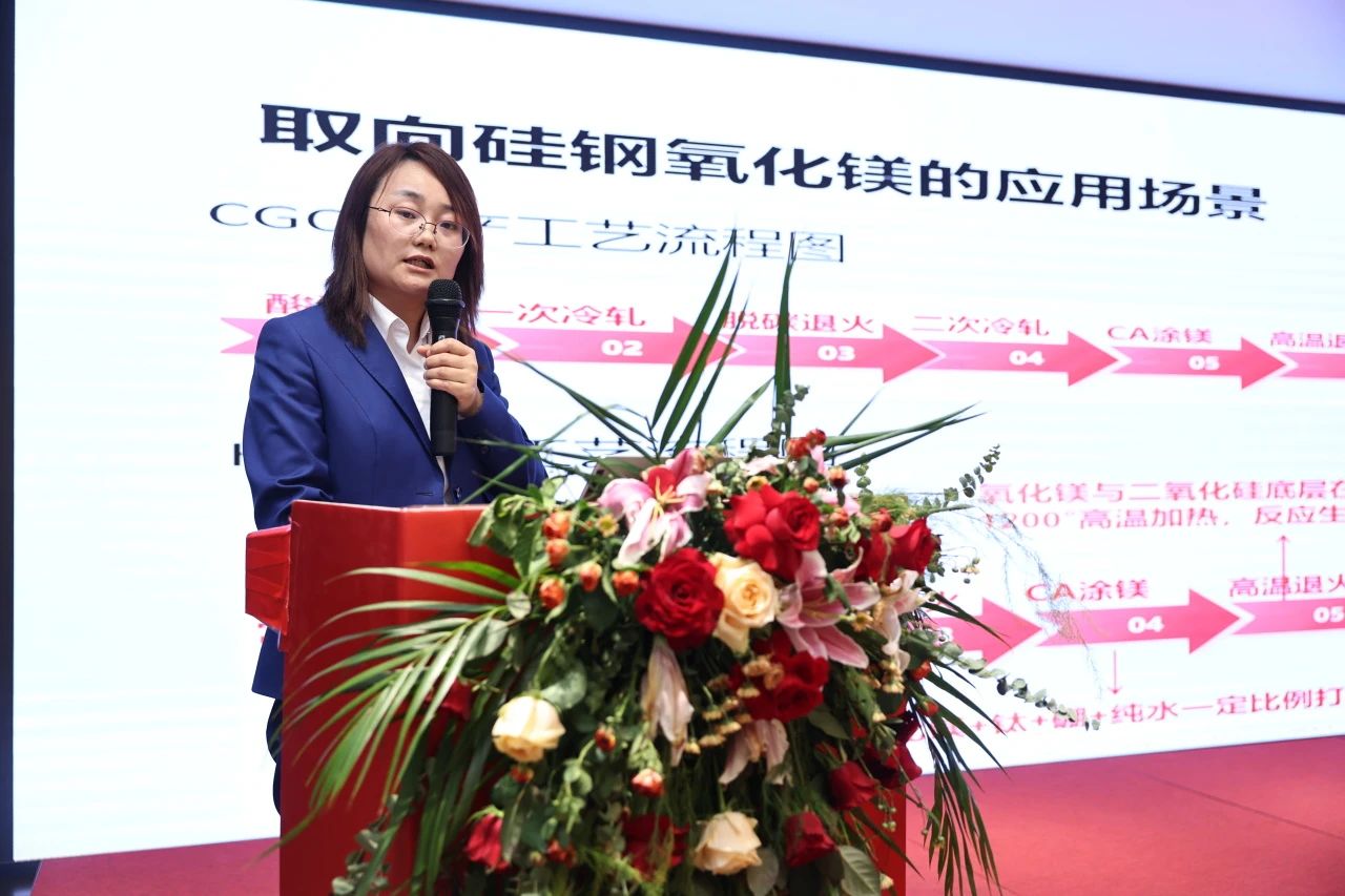 在镁神科技研发总监白雪梅女士的致辞中,她对镁神科技多年来在氧化镁领域的技术积累和创新成就做出进一步回顾,特别是对HIB钢专用氧化镁项目做了详细介绍。她强调,镁神科技在全球率先建成了双层六列电加热辊道窑生产线,通过先进的自动化生产和严格的质量控制体系,确保产品的高纯度和稳定性。白总监还指出,镁神科技将继续致力于技术创新和产品优化,以客户需求为导向,提供更优质的定制化解决方案,助推取向硅钢产业高质量发展!