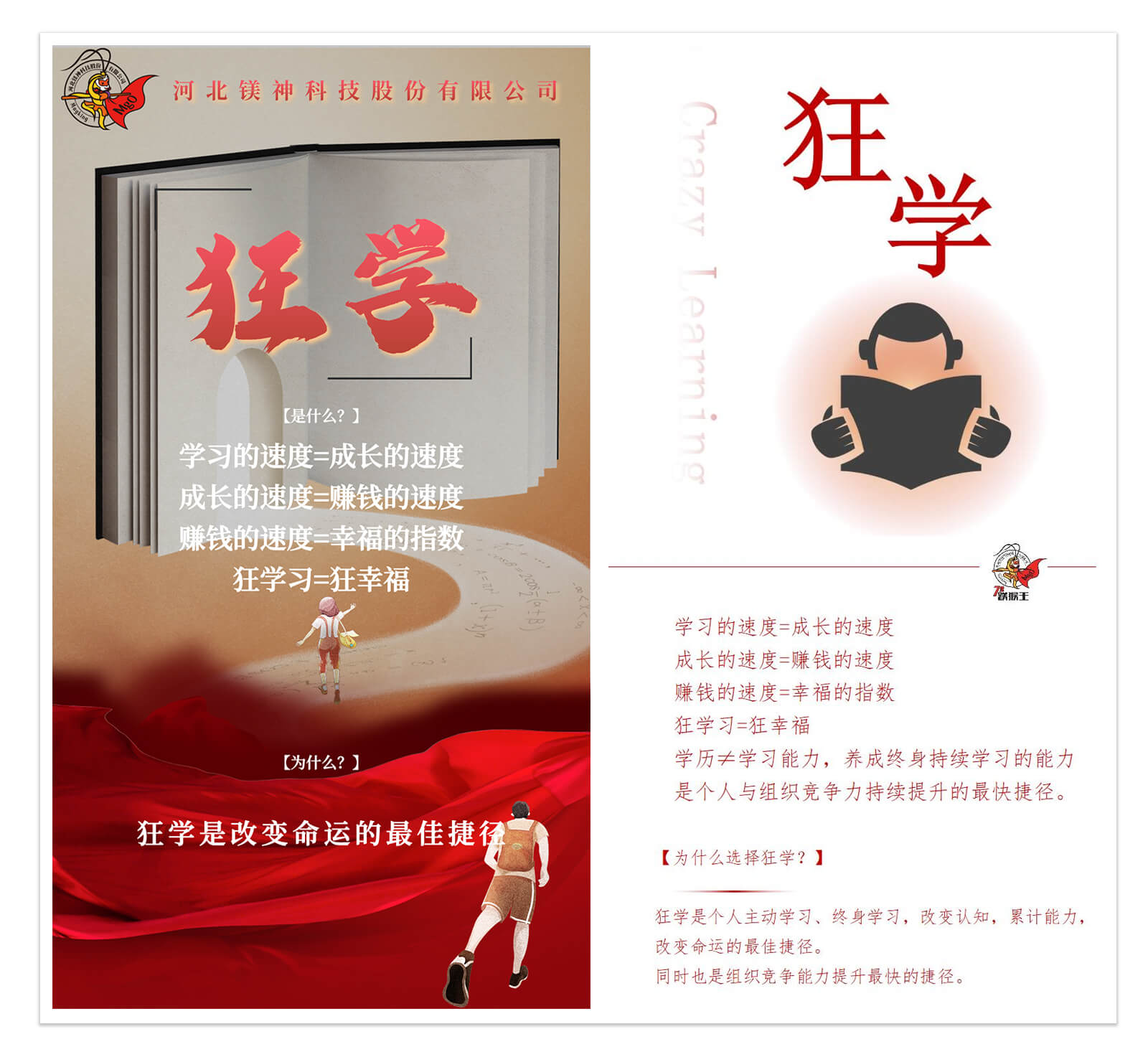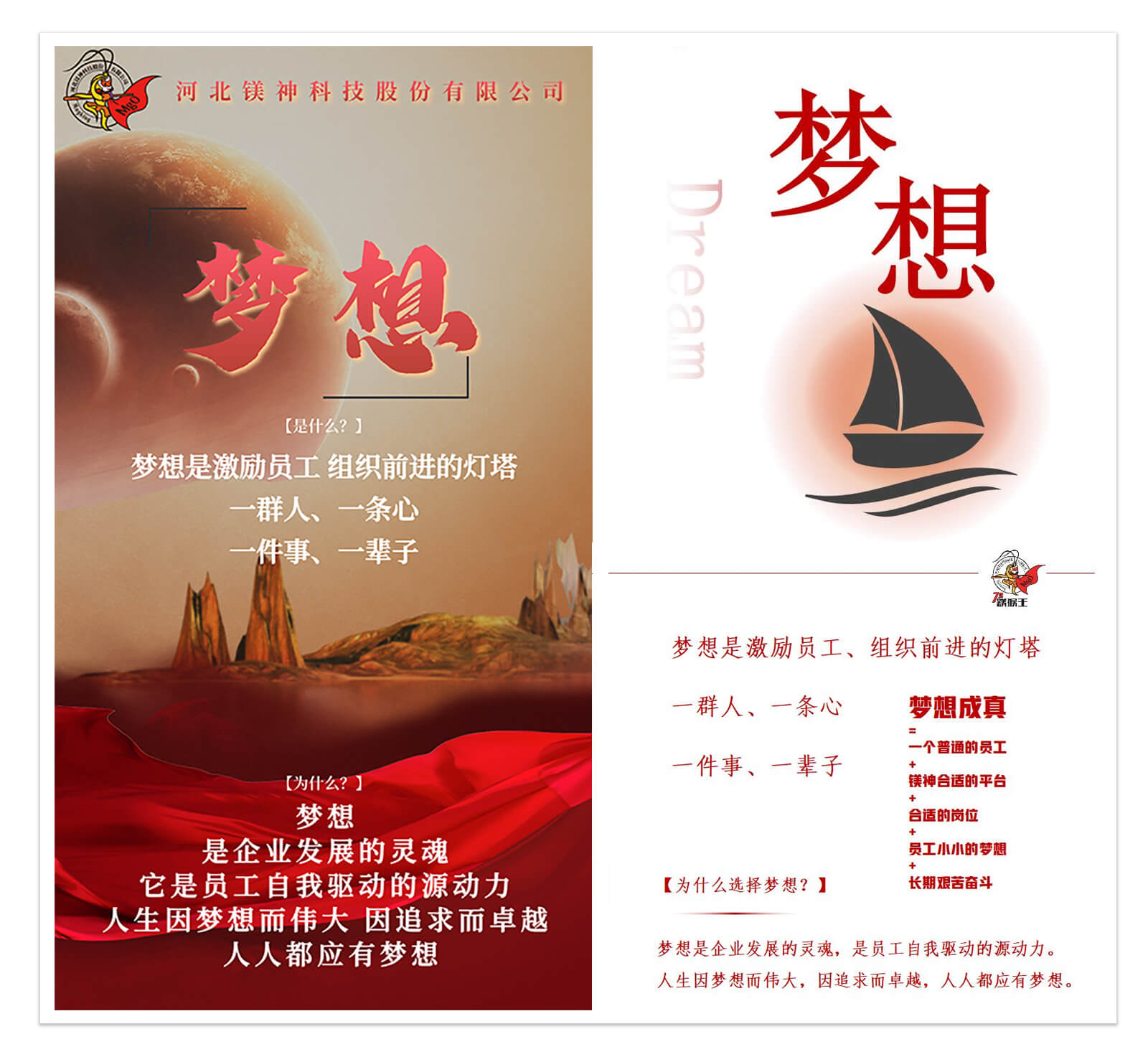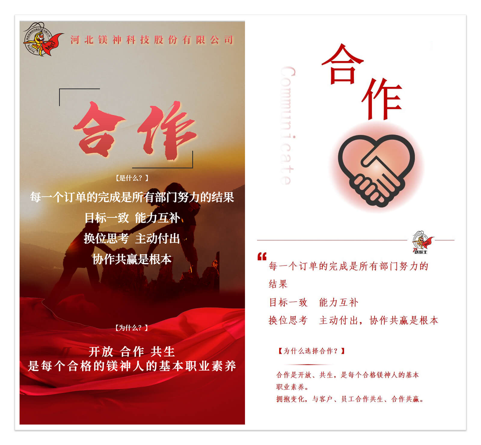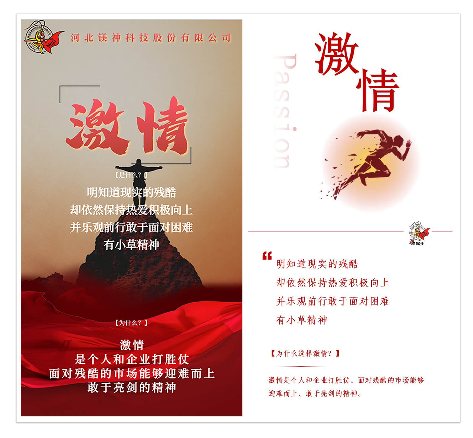 镁神科技以创办实业,发展经济,造福一方,共同富裕为初心;秉承着为全球用户提供更适合的氧化镁,为人类健康、科技创新、可持续发展作出贡献的使命;有着创建百年镁神平台,让客户、员工、股东共同发展、共同快乐、共同富裕的美好愿景;培育出拼搏、坚韧、越挫越勇的镁神人。镁神人用诚信、激情、梦想、狂学、内省、沟通、合作、创新、利他的价值观向客户、社会各界朋友诠释着镁神的企业文化!
